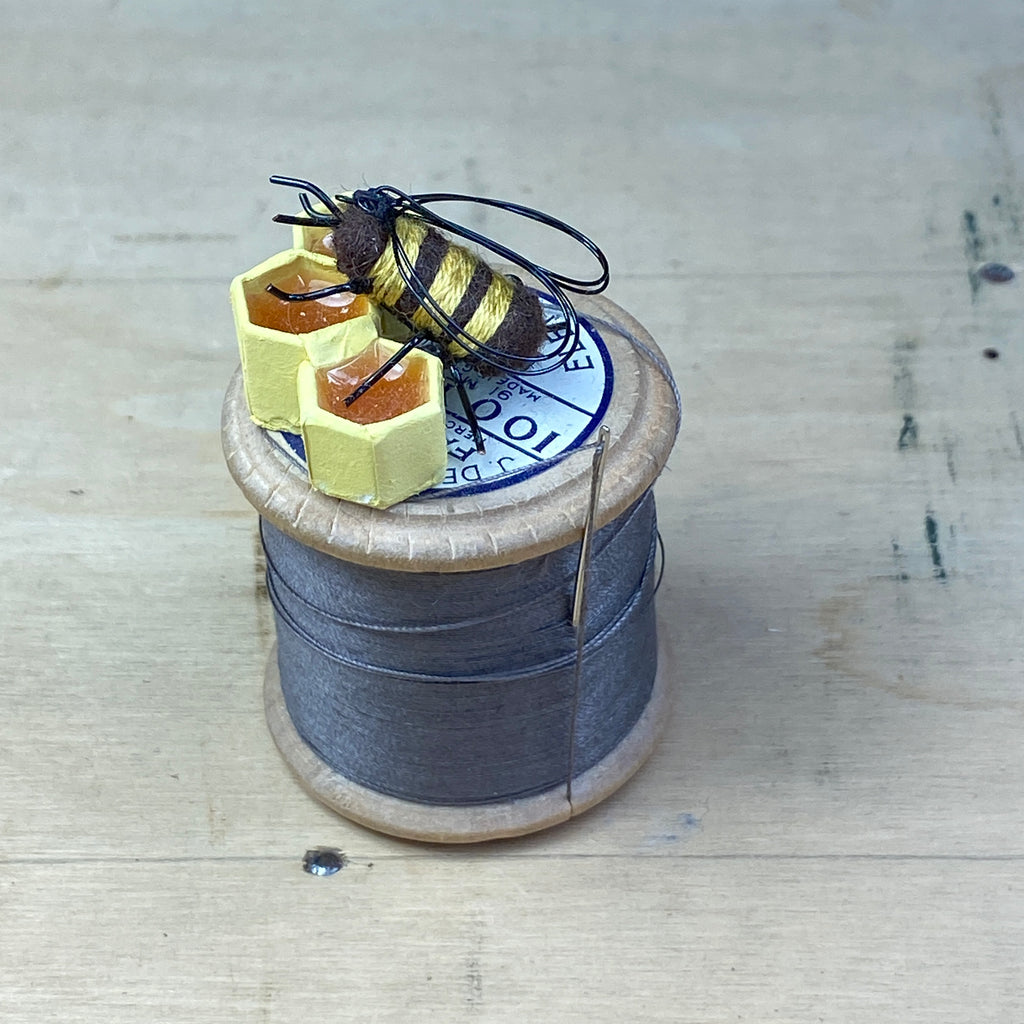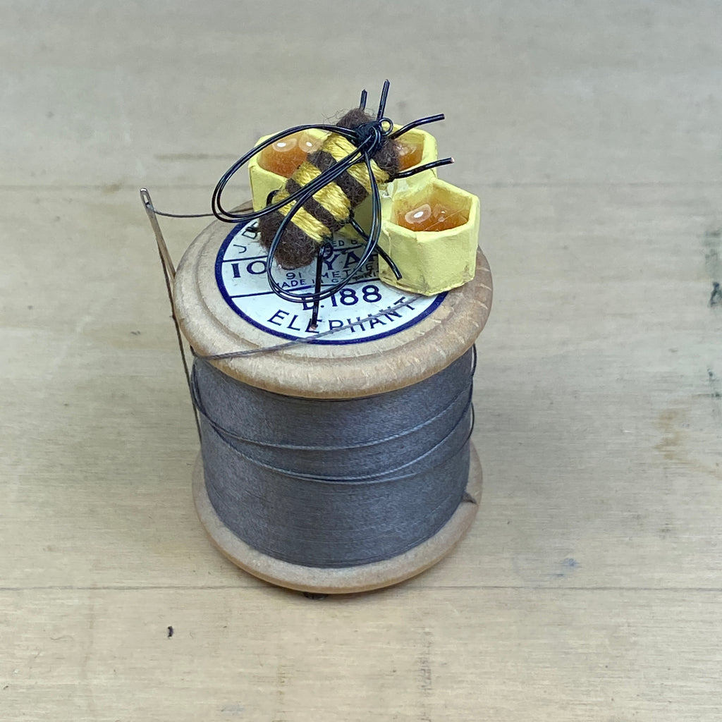 A lovely wee mixed media Sewing Bee created from a vintage wooden cotton reel, handmade honeycomb, needle and felt bee.