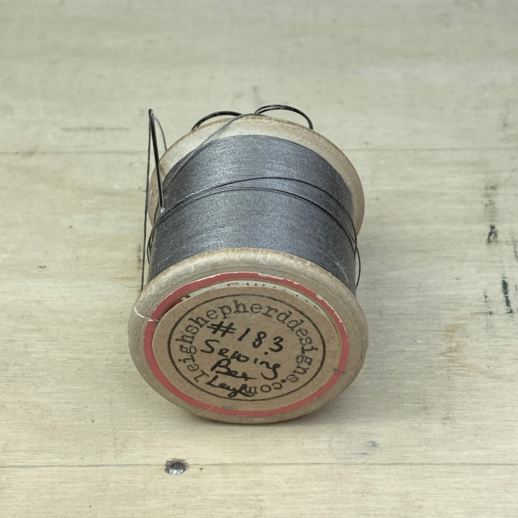 I made this piece from a vintage Sylko wooden cotton reel, the original label is visible on the top. The thread is a warm grey colour described on the label as 'Elephant'.