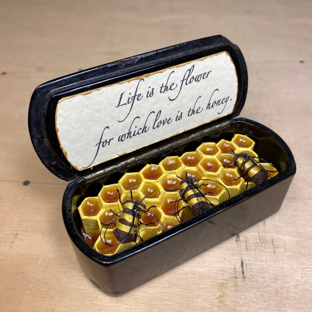 This little Secret Hive is made inside a lovely hinged Victorian papier mache laqured box.