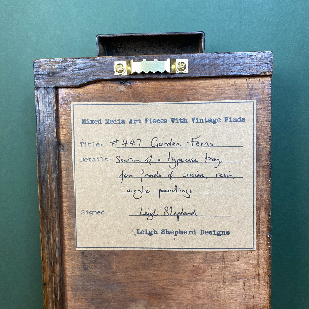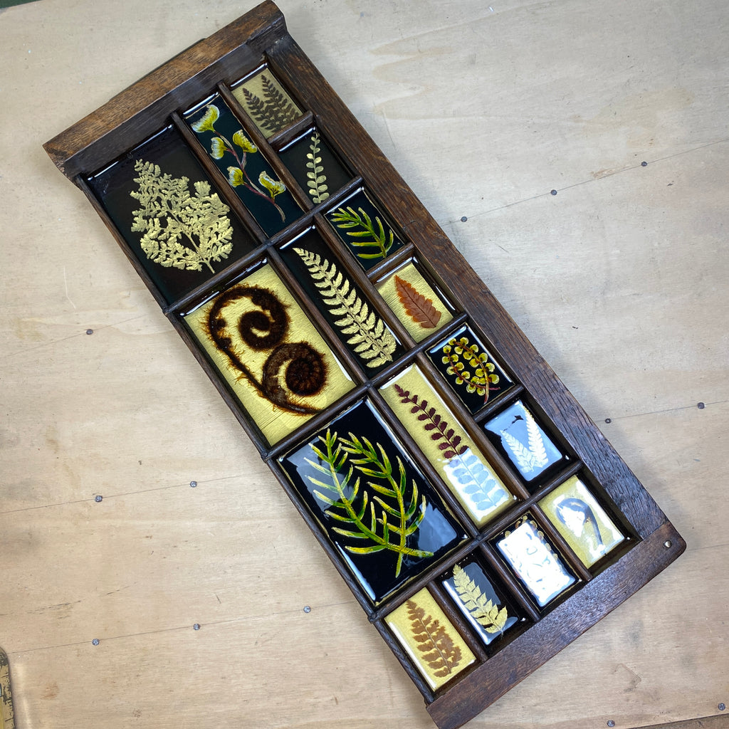 This is one of my largest pieces and contains real fern fronds and crosiers, gold painted Spleenwort fronds and paintings set in several layers of resin.(Bearing in mind each layer needs two days to dry, these pieces take quite some time to make :)