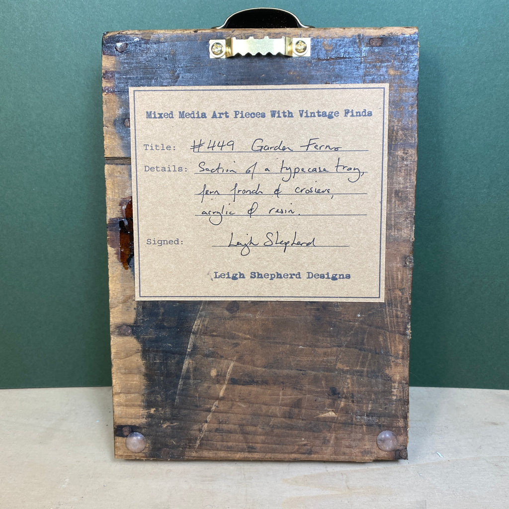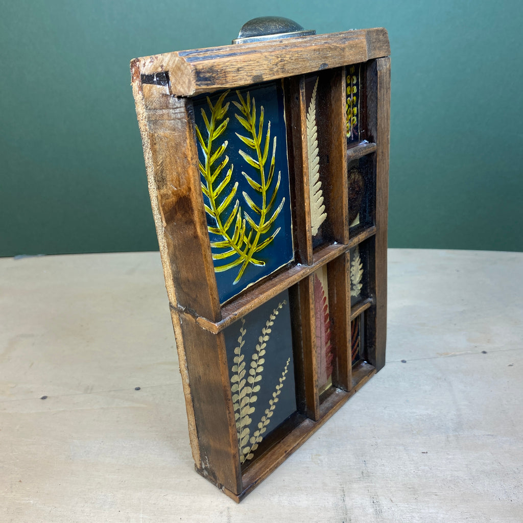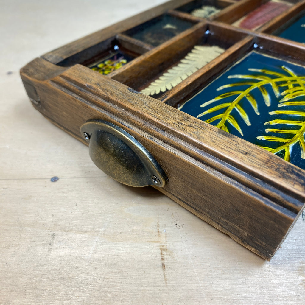 A really stunning mixed media piece created from a section of a type case / wooden printmakers tray. The wood has a lovely warm, silky aged patina. I have waxed the wood to protect the finish.