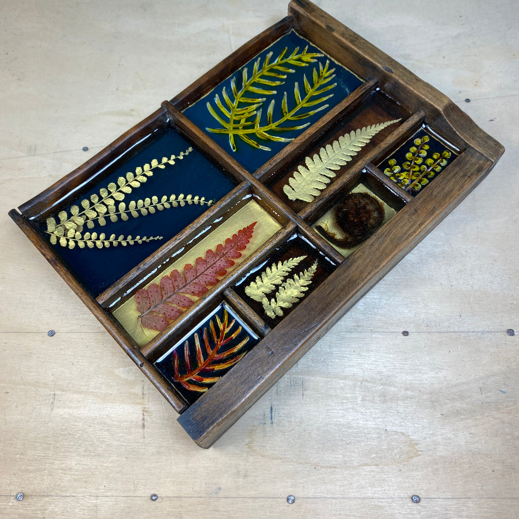 This piece contains a crosier (the curled young fronds) , gold painted fronds and paintings set in several layers of resin. (Bearing in mind each layer of resin needs two days to dry, these pieces take quite some time to make :)
