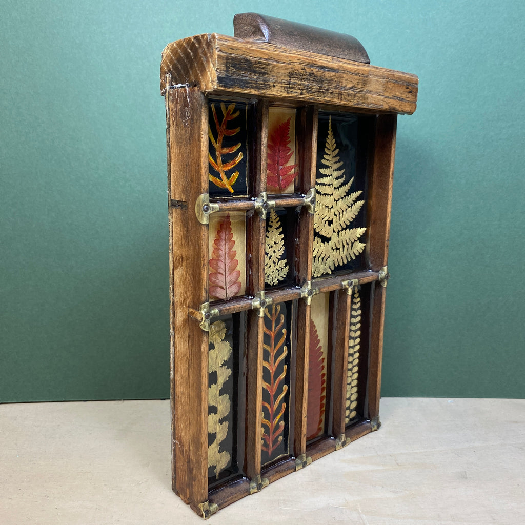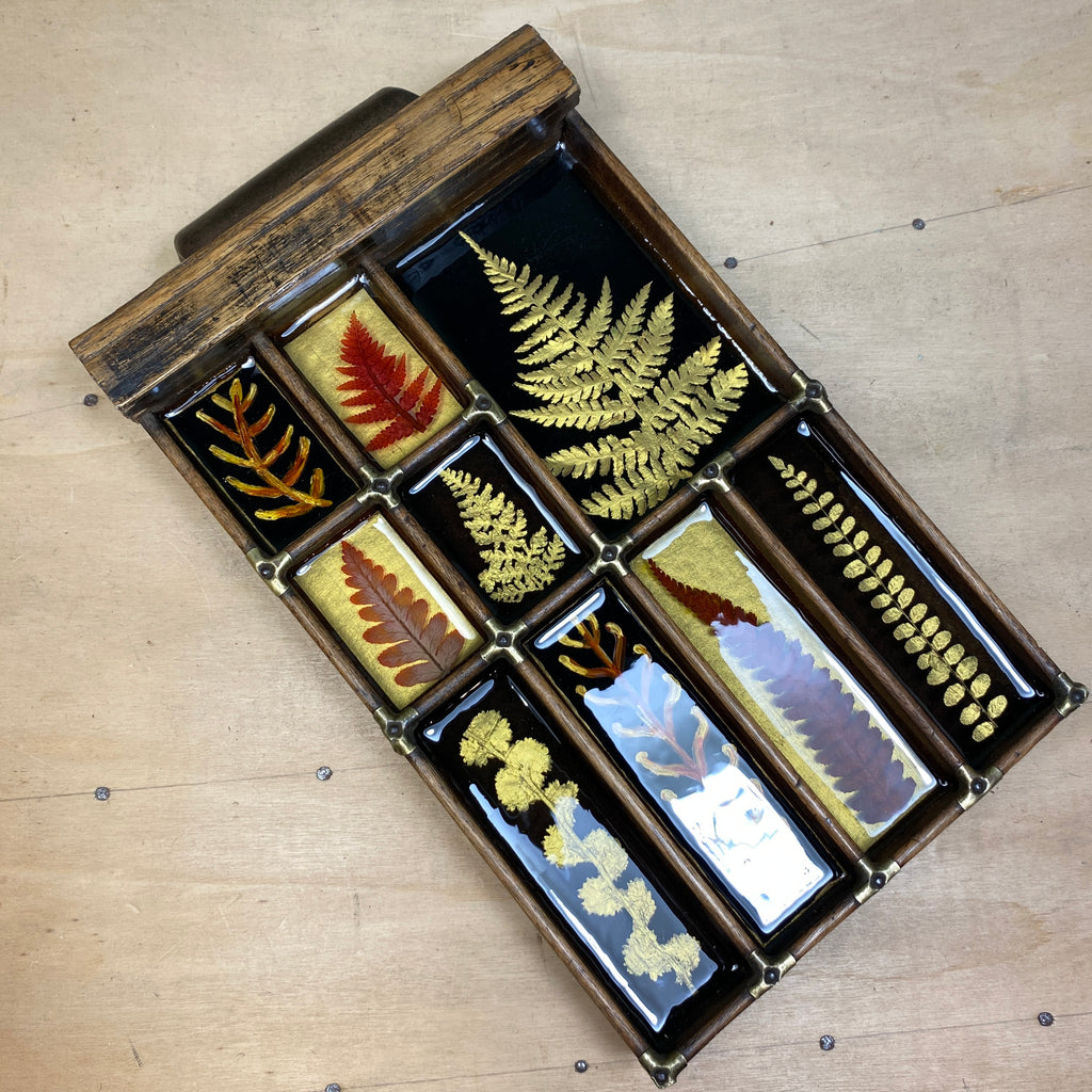 This piece contains a crosier (the curled young fronds) , gold painted fronds and paintings set in several layers of resin. (Bearing in mind each layer of resin needs two days to dry, these pieces take quite some time to make :)