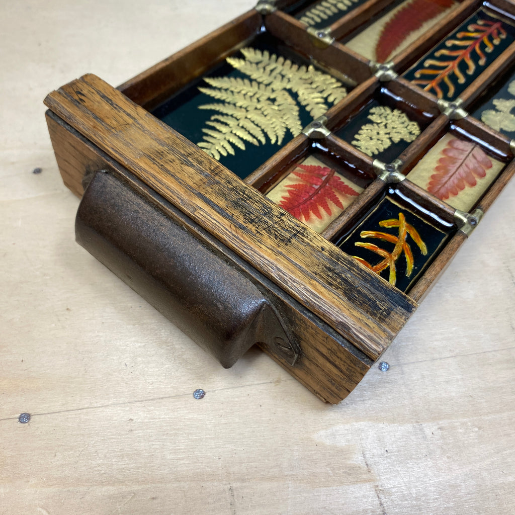 A really stunning mixed media piece created from a section of a type case / wooden printmakers tray. The wood has a lovely warm, silky aged patina. I have waxed the wood to protect the finish.